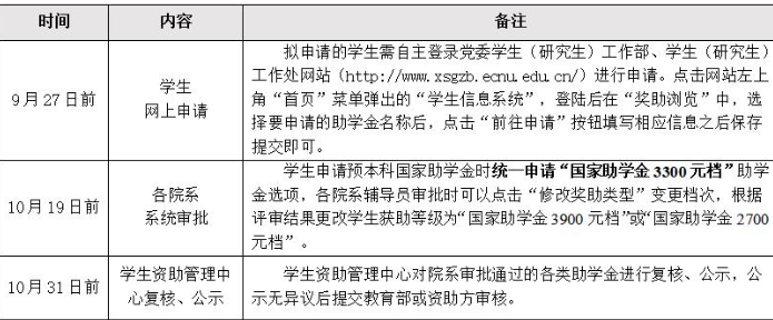 预本科生 国家助学金  | 平均3300  | 1、已通过我校家庭经济困难认定的预本科学生; 2、不含公费师范生; 3、原则上(1)通过认定的建档立卡等特殊困难学生应以第一档次全覆盖(2)特别困难、比较困难等级的新生应优先覆盖。  | 1、名额:14; 2、系统打印出来的《本专科生国家助学金申请表》纸质版一式一份于10月19日前提交到学生资助管理中心; 中北:大学生活动中心504 闵行:学生之家B304 3、电子版《国家助学金(预本科)获助学生名单汇总表》(详见附件2)请于10月19日前邮件发送到[email protected]。  |