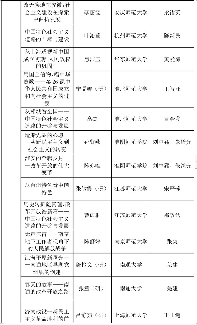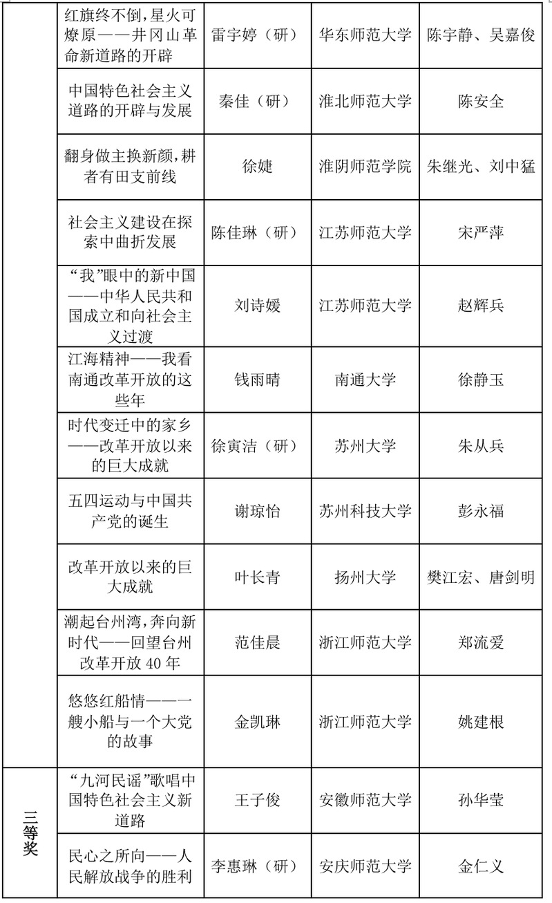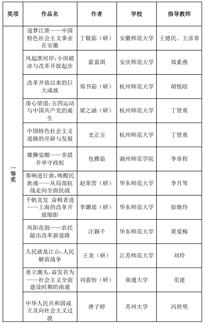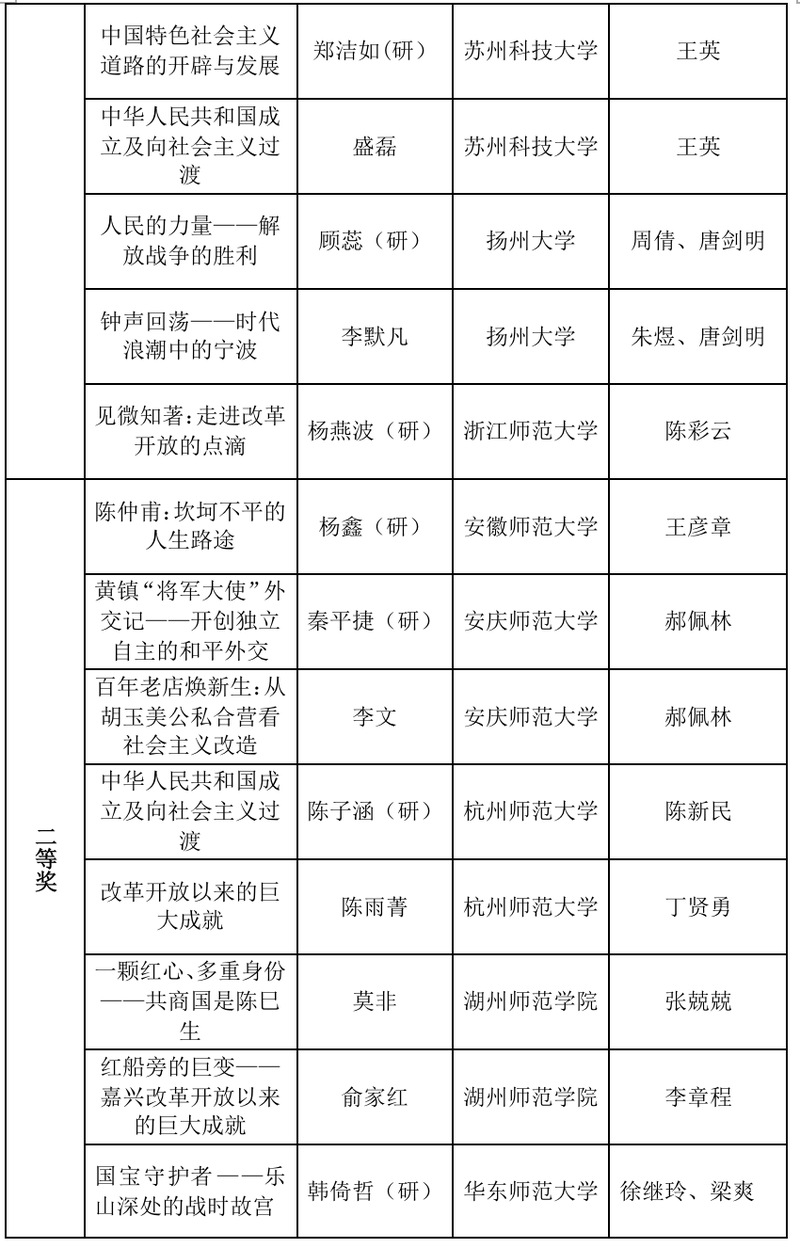 本届长三角历史学师范生“四史”教学技能大赛共收到来自16所学校100余份作品。本次大赛由教学设计、微课视频两部分构成,邀请了华东师范大学、南京师范大学、浙江师范大学等高校教师,共计21位专家参加了分组匿名评审,最终评出个人奖60个(其中一等奖17个,二等奖19个,三等奖24个)、优秀指导教师49名。